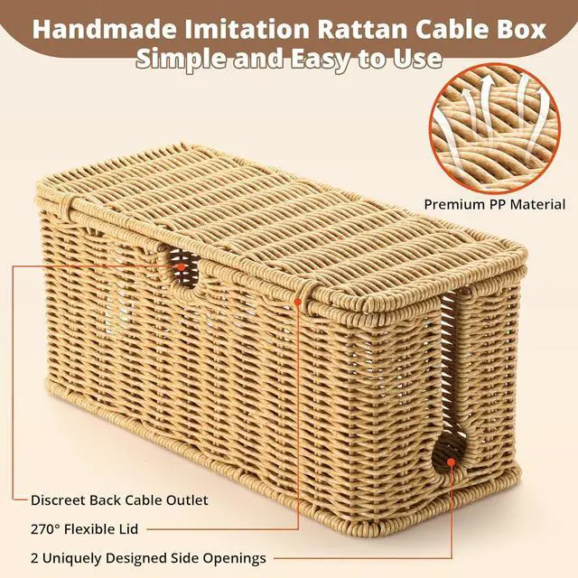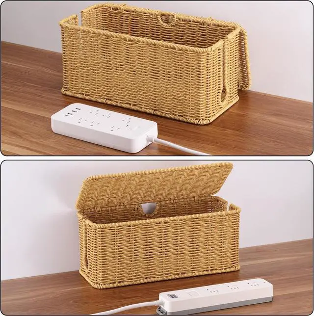 Sturdy & Stylish Construction: Featuring a coated metal frame and neatly woven synthetic rattan, this wire organizer combines style and durability. The hinged lid and open slots enable easy cord management while keeping your space tidy and organized