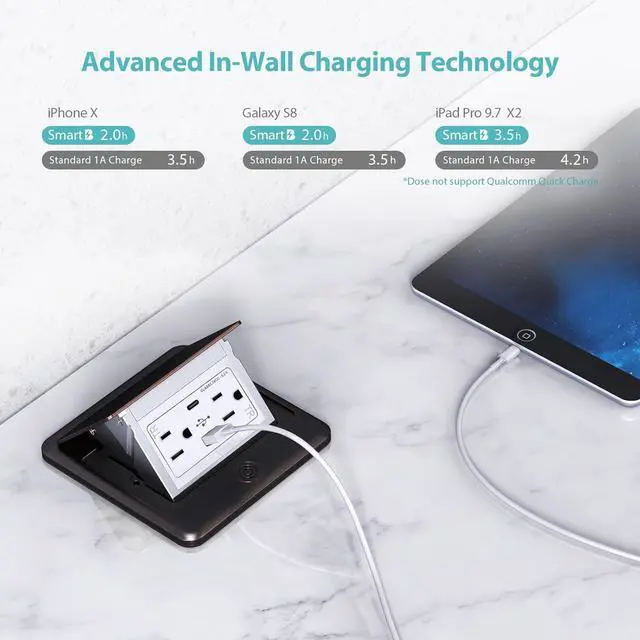 Intelligent USB ports precisely read the power needed to maximize charging efficiency up to 2.4A per port or up to what the device allows without overcharging (does not support Qualcomm Quick Charge technology).