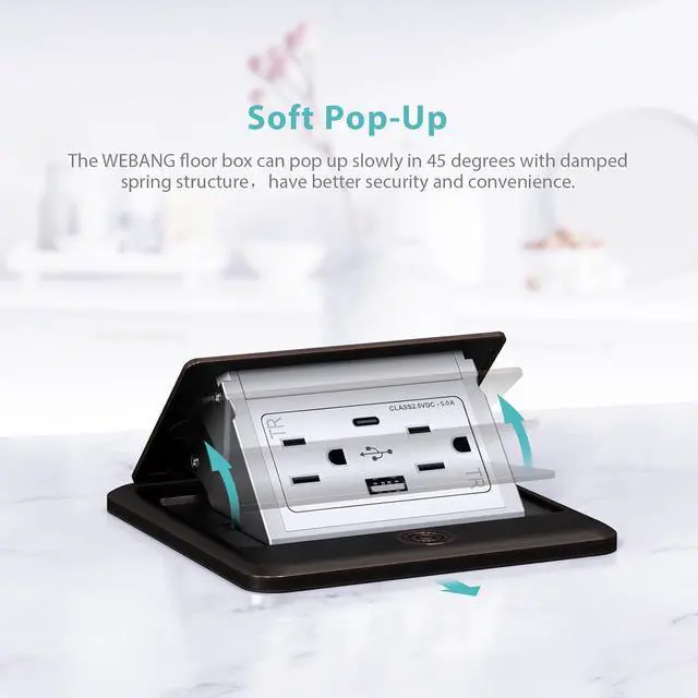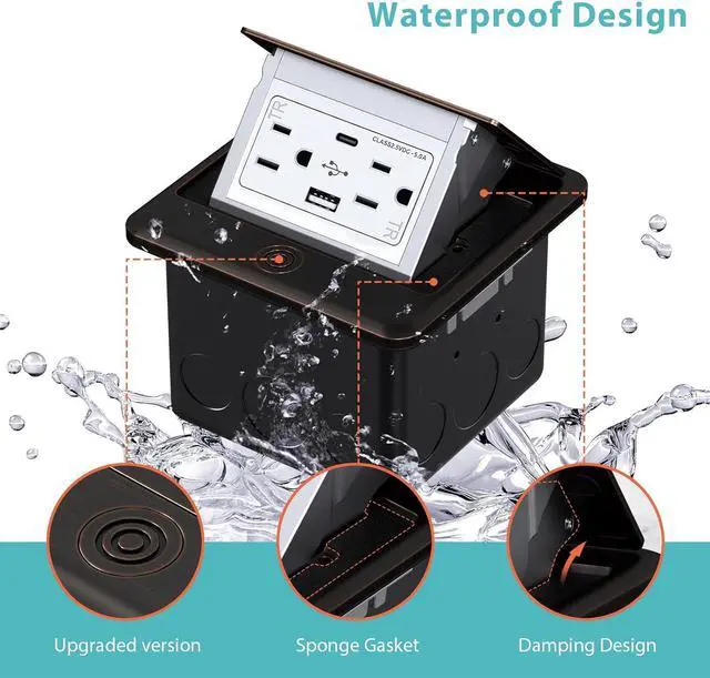 ETL-listed, EASY TO USE - Pops Up When In Use, Hides In The Box When Not In Use, and water proof. The waterproof gasket with IP 44 rated protection can prevent ingress water spray from any direction when closed.