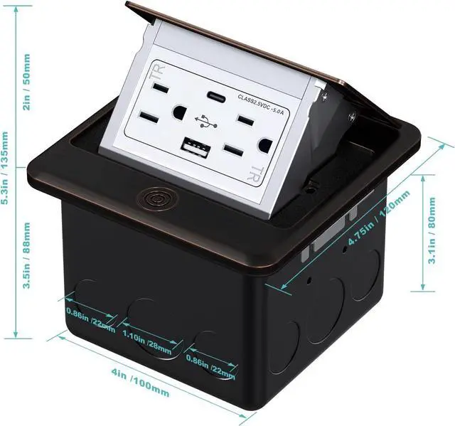 Dimensions: Overall: 4.75" x 4.75" x 3.5" - Cover Length: 4.75" Cover Width: 4.75" Cover Height: 2.7" (closed) 2" (Raised) | Junction Box Length: 4" Junction Box Width: 4" Junction Box Height: 3.15" Floor Box Kit: Includes a hard material polished stainless steel floor box flip up cover with twisting lock, one 15A USB duplex tamper resistant receptacle, one galvanized steel junction box with 12 side and bottom knockouts.