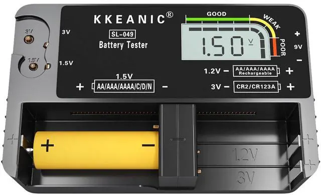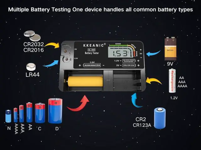 Versatile Multi-Battery Design - Expertly tests virtually all common battery types with dedicated testing slots. Compatible with AA, AAA, AAAA,C, D, N, 9V, and various button cell batteries including CR2016, CR2032, and LR44. Uniquely tests 1.2V rechargeable AA, AAA, and AAAA batteries.The smart detection system prevents incorrect testing.