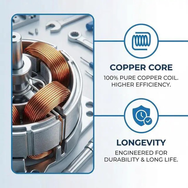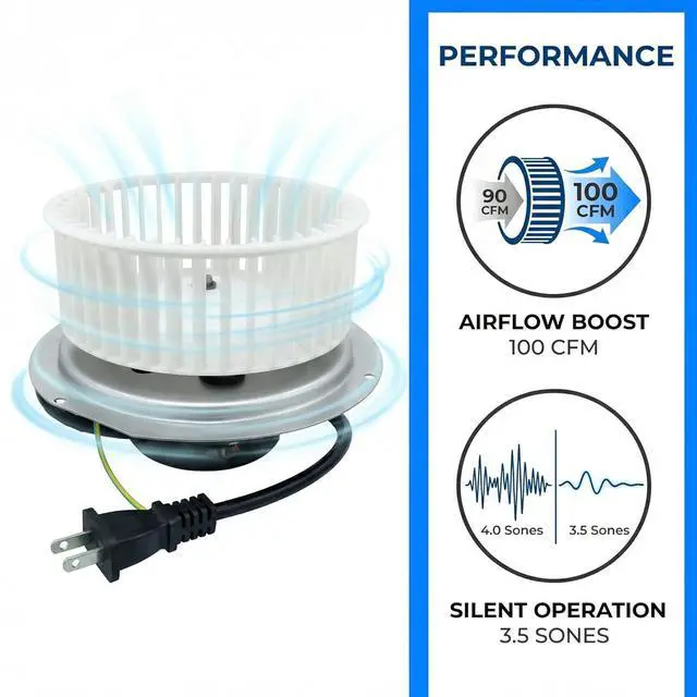 Quiet & Powerful Performance This QT-100L bathroom fan motor features a high-quality copper-wound motor for superior conductivity compared to original aluminum motors, ensuring exceptionally quiet operation at only 3.5 Sones. It delivers a powerful 100 CFM airflowan upgrade from the common 90 CFMto efficiently eliminate moisture, steam, and odors from your bathroom