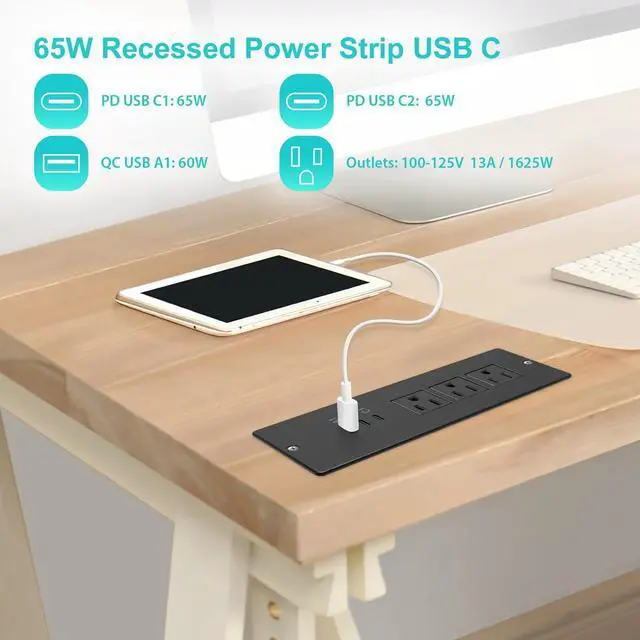 [Support PD 65W & QC 60W Fast Charge] The desk power strip with 2 USB-C Ports and 1 USB-A Port. The max power of USB-C port is 65W, can charge the Laptop,pc, tablet quickly. The max power of USB-A Port is 60W, can charge the phone fast, saving your charging time.
