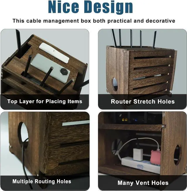 Router cover organizer has a hollow-out design, which does not block the signal. Multiple routing holes, convenient to organize wires and cable, prevent tangling and knotting. Router hider box helps to keep all items neat, tidy and not exposed, good heat dissipation and ventilation ensures the safety of use.