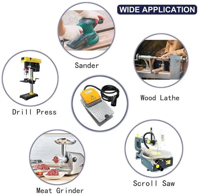 Press down and hold the pedal to use your machine and release the foot pedal to stop. No variable speed control, but is compatible with variable speed equipment.
