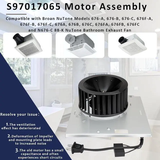 Compatible or Replacement Part Numbers: S97017065 Motor Assembly Replacement 97017065, S97017065, Compatible with Broan NuTone Models 676-A, 676-B, 676-C, 676F-A, 676F-B, 676F-C, 676A, 676B, 676C, 676FA, 676FB, 676FC and N676-C 88-K