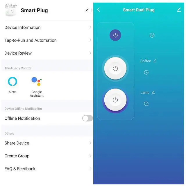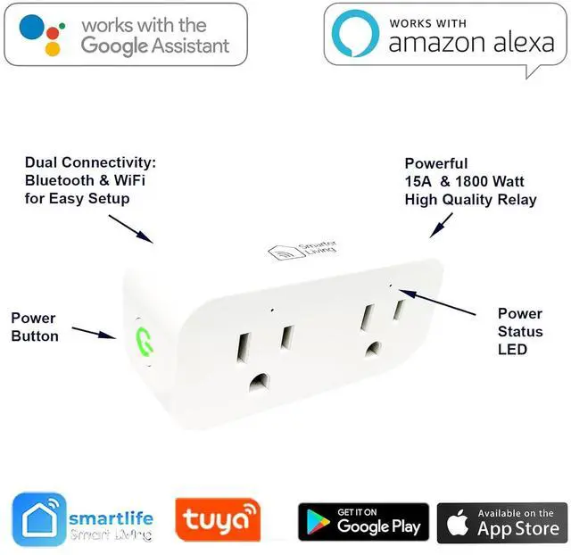 : Control each socket independently in Alexa, Google, Tuya, Smartlife. Each socket will appear in Alexa and Google Home with the independent names set in Tuya / Smartlife for each socket. Name of each socket can also be renamed in Alexa or Google Home.