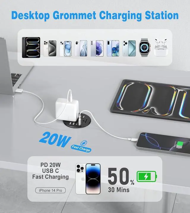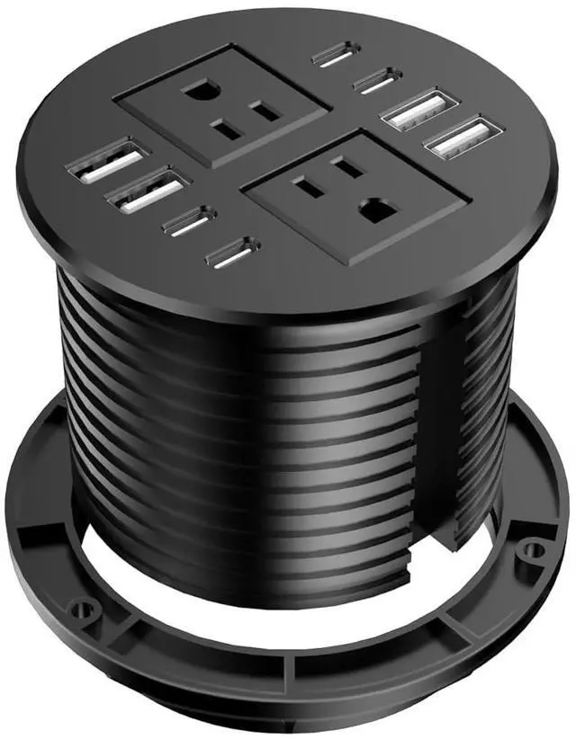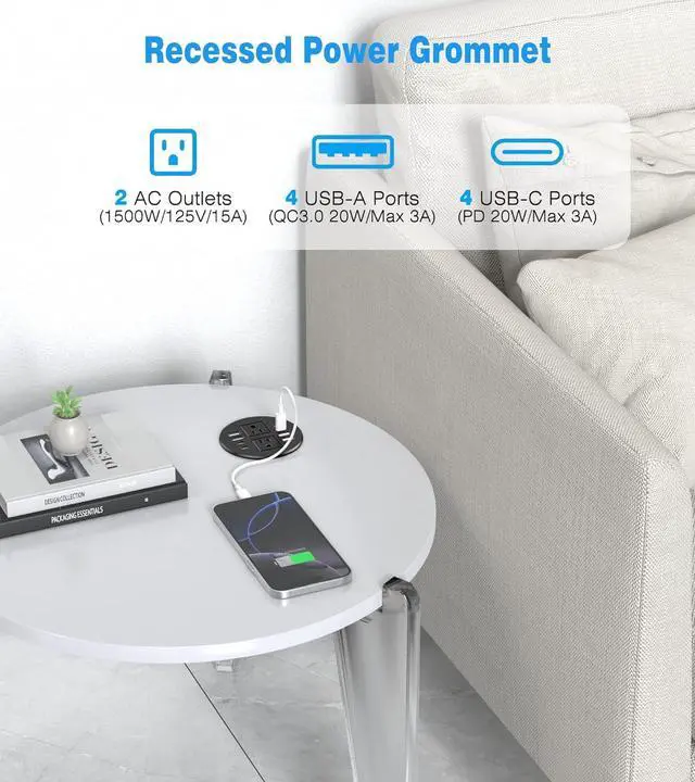 3.15in Desktop Grommet Outlet: 4 fast charging QC3.0 20W Max USB-A port and 4 PD3.0 20W Max USB-C ports. Come with 2 AC Outlets. Great addition to nightstand or furniture table.