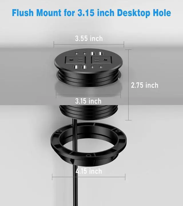 Easy Installation: Simply drill a 3.15(80mm)inch hole in your desk or use an existing one, insert the outlet, and secure it with the included locking ring.