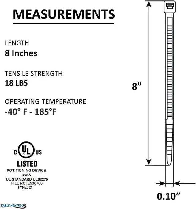 UL Listed: Our zip ties are UL Listed, File No. E530766 Positioning Device 33AS, UL Standard UL 62275 TYPE 21, ROHS compliant, are Military and Federal Grade | ASTM- D4066 PA210
