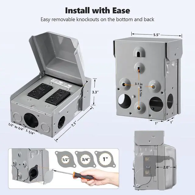 No Drilling Required: This outdoor outlet box has pre-punched knockouts on the sides, bottom, and back for easy installation, with three hole sizes (1/2", 3/4", 1") for secure connections; Ideal for both DIY users and professionals, it works perfectly as an outdoor receptacle outlet box
