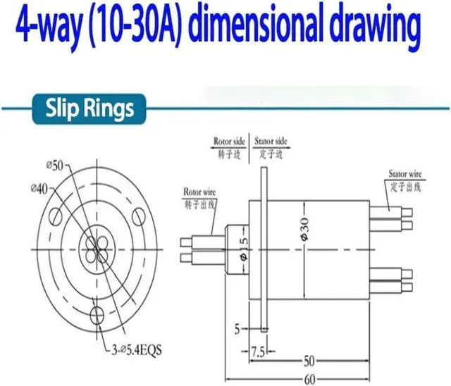 5. SPECIFICATIONS AND INSTALLATION: Electrical Slip Ring: positive and negative 360 degrees rotation, 4 Wires 30A Diameter 30mm. simple installation: slip ring into the sleeve, fixing screws, connect the wire can be.