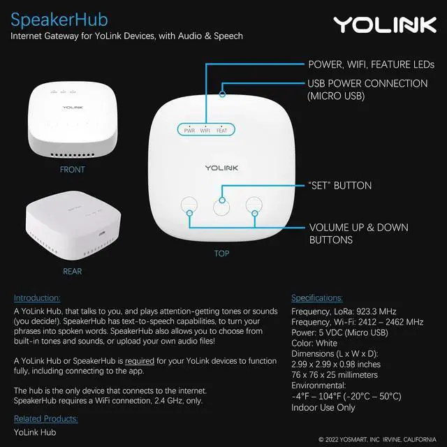 Requirements Android or Apple smartphone, stable WiFi connection (SpeakerHub does not have an Ethernet port), and USB power or an AC outlet nearby for the plug-in power adapter