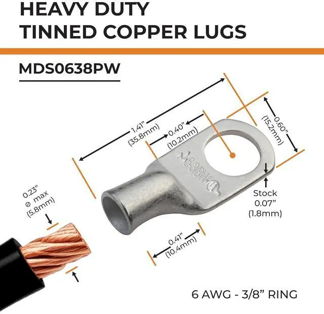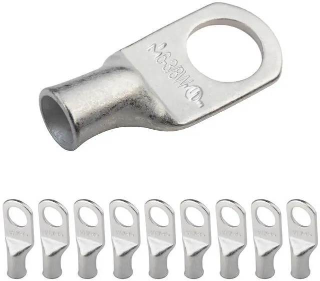 PACKAGE CONTENTS - 10 PCS. of Marine Grade Tinned Copper 6 Gauge (AWG) 3/8" Ring Battery Terminal Connectors / Lugs. 100% annealed tinned copper, providing a high degree of conductivity for maximum current flow when used as battery terminals.