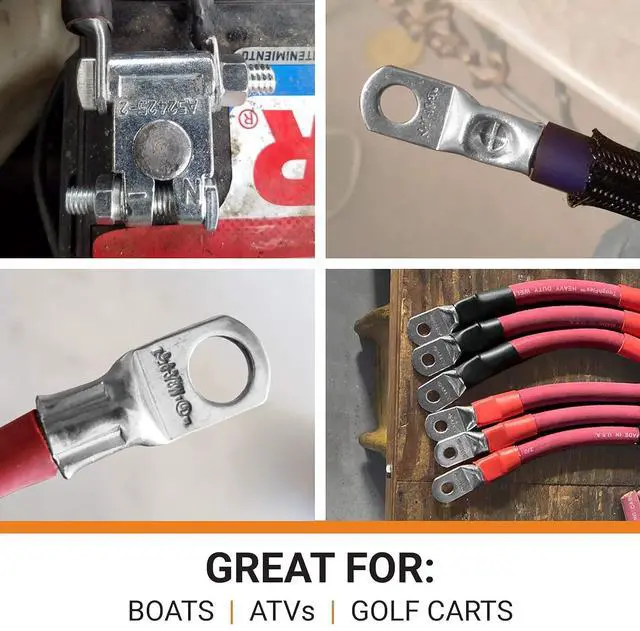 WIDE APPLICATIONS - Selterm tinned copper lugs wire connectors have a close end pad design, keeping electrical components, battery and wire cables safe and act as waterproof wire connectors which prevents solder from leaking during installation of lugs or while using as a heat shrink wire connectors for your battery in Marine, Golf Carts, RV's, Automotive and other outdoor equipment.