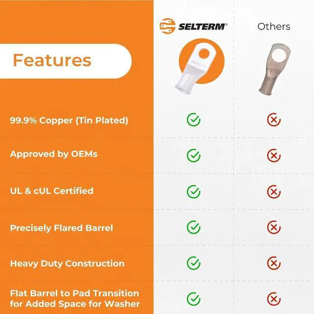 PERFECT FIT - Selterm provides freedom to choose from wide range of wire sizes, stud sizes, and pack quantities from 2 - 25 pcs. best suitable for all requirements and applications as a battery connectors. Superior material quality of tinned copper terminals lugs can be crimped or soldered. Use with a compatible copper cable; Audio wire may not be a direct fit. Recommend to check product dimensions to ensure a proper fit of the connectors.