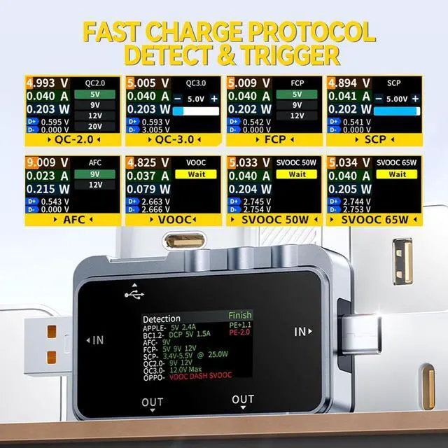 Multi-Functional: The FNAC-28 USB Tester is a multifunctional interface USB voltage and current test meter and mobile communication terminal fast charging trigger instrument. It can be used to measure the USB interface, cell phone charger, U disk, and other products' power supply or power consumption. It can also be used to measure the cell phone charging power, mobile power input and output conditions, and for charger fast charging protocol test