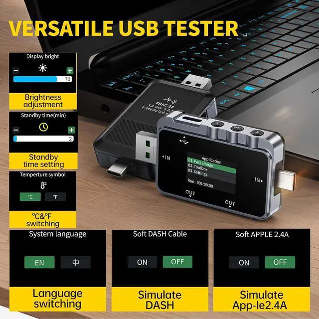 Comprehensive Coverage: FNAC-28 USB Tester provides comprehensive coverage of chargers, all kinds of data cables, charging treasure, laptop charging test, and interface performance. It also features multi-group data logging, accurate battery capacity detection, cable detection, adjustable brightness/custom standby time/temperature symbol switching/language switching/analog DASH/analog App-le2.4A, and more