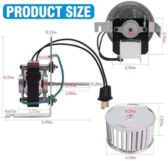 82229000 Fan Motor Assembly: 82229000 bathroom vent fan motor assembly: 120V, 60Hz, 0.8A, 3000 RPM, CCW Shaft End. Our bathroom motor fan replacement includes 1x fan motor and 1 x wheel. Standard two prong plug, shaft measures 7/32" x 2-3/8", blower wheel measures 3-3/4" diameter x 1-7/8" high (Please compare carefully with the parameters and size of your own fan motor kit before ordering)