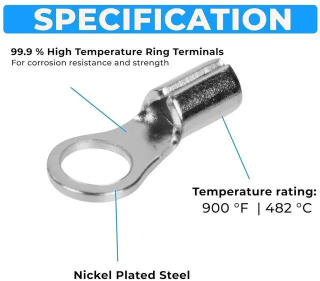 Our ring terminal kit has a maximum temperature of 900-degrees Fahrenheit and 482-degrees Celsius
