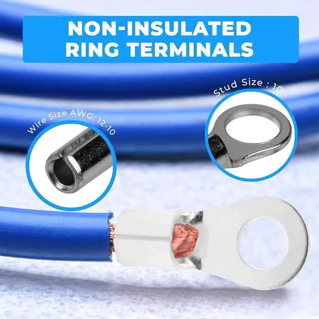 This ring terminal kit has ring terminals with a wire size of 12-10 AWG and studs size of 10 inch