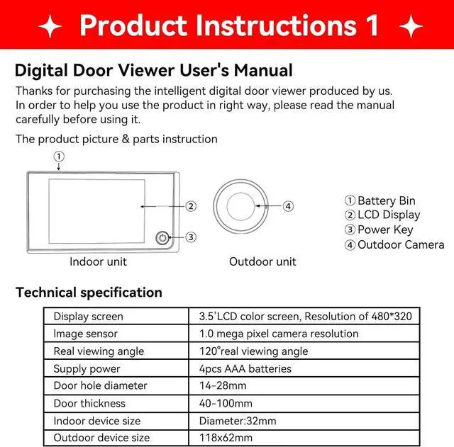 WIDELY USED: This peephole camera is widely used in home office hotel apartments and other places, hole, suitable for door thickness. Door Hole Range: 14-28mm, Door Thickness: 40-100mm