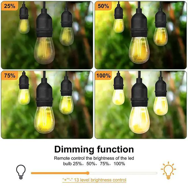 DIMMING FUCTION AND MEMORY FUCTION: Outdoor dimmer for string lights,it have 4 kinds of brightness adjustment 25%, 50%, 75%, 100% brightness ,and it have 13 non-polar dimming mode, you can adjust the light brightness by "+" "-". In addition,our string light dimmer have memory function for brightness,save your time so you don't have to reset. Note:Only compatible with dimmable LED and incandescent bulbs. Not suitable for non-dimmable bulbs, low-voltage lights, or smart plugs with power interruption.