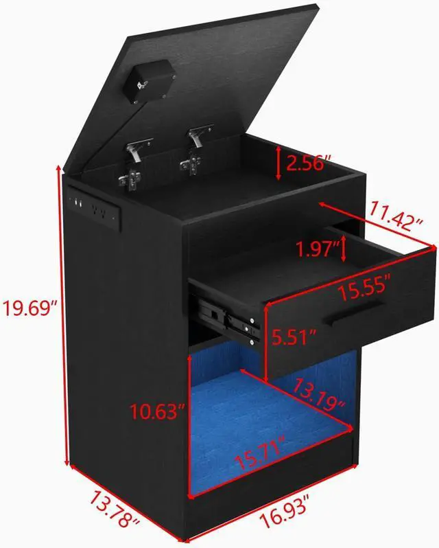 Bedside Table with Charging Station - Don't worry the furniture blocks most outlets anymore, this nightstand comes with 2 AC Outlets & 2 USB Ports for powering your phone, tablet, lamp, game console and etc. And one USB Port is applied to connect the led light, another one is applied to connect the electronic lock.
