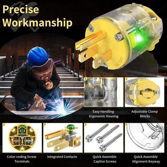 Precise Workmanship: Ergonomic housing for easy handling, alignment keyway and captive screws for quick assembly and disassembly, color-coded screw terminals for faster and more accurate wiring, and a pair of adjustable rear cord clamps that accommodate various sizes of wires. All these features are ideal for both making new power cables and repairing extension cords