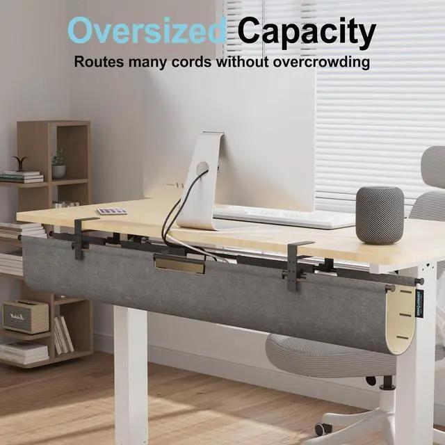 DOUBLE-SIDED FELT DESIGN Use the grid side of this desk cable management tray to thread cords and hold power strips, or flip to the solid side for a sleek look. A versatile desk cable organizer for any home office or gaming setup