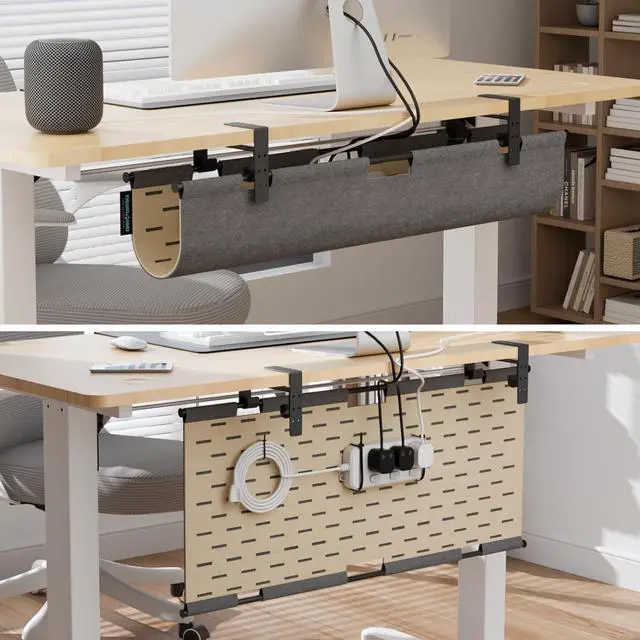 FLEXIBLE MOUNTING OPTIONS Easily hang the felt cord organizer using the metal rods on both sides, or drop one side for use as a desk privacy panel. Supports clamp mount and screw mount for secure cable management solution