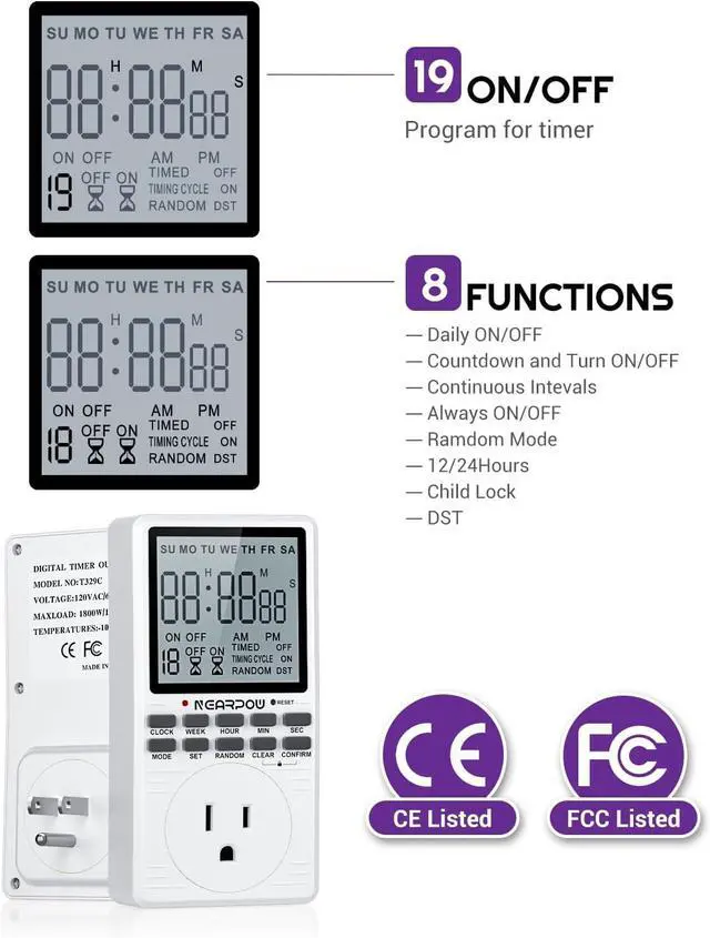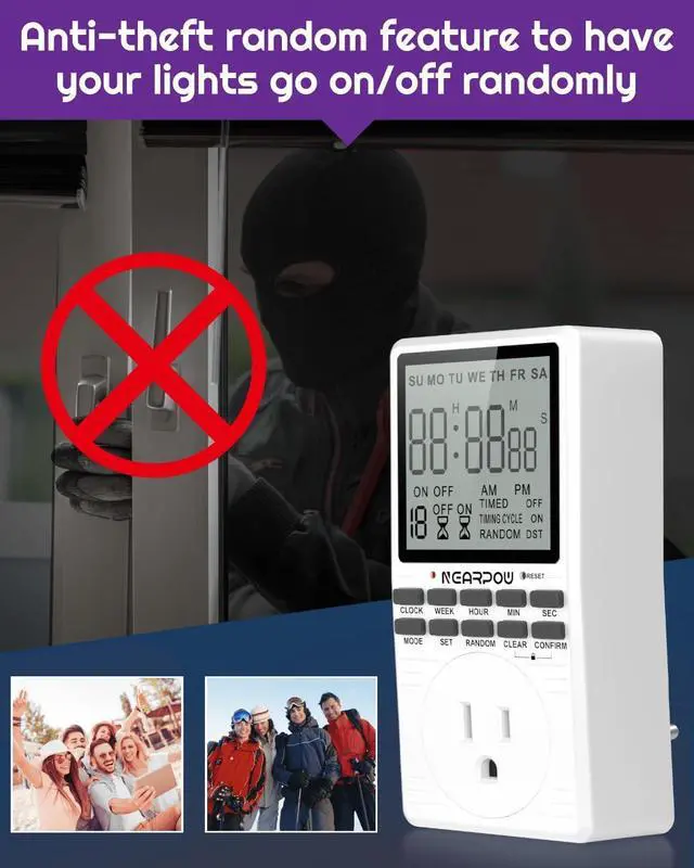 [Additional Functions] 12/24 Hours System to show AM/PM conveniently. Always ON/OFF to quick set the appliance to work all the time or let it stop. Daylight Saving Time just one step. Random Vacation Mode to make your home look lived in even when youre away, thus protecting your home from thieves. Child Lock Function to protect saved programs