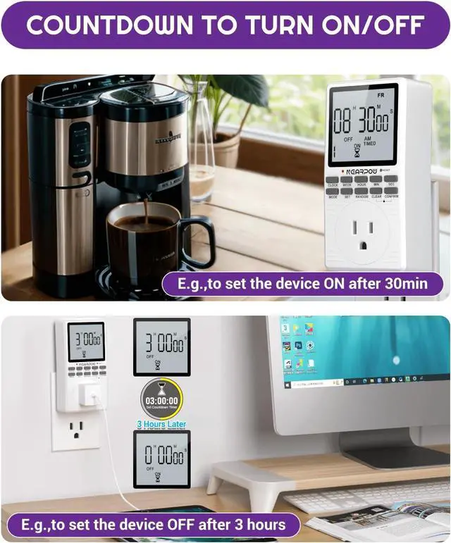 [Up to 19 ON/OFF Programs] The timer outlet offers up to 19 individual schedules to turn on/off electronics automatically. The 7-Day programmable timer switch also provides up to 15 choices for week setting