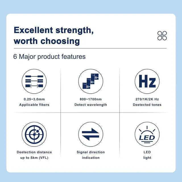 Simple Operation: User-friendly interface with straightforward buttons for power, signal detection, and wavelength selection.