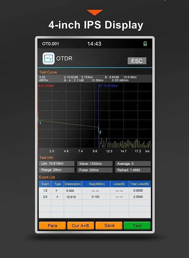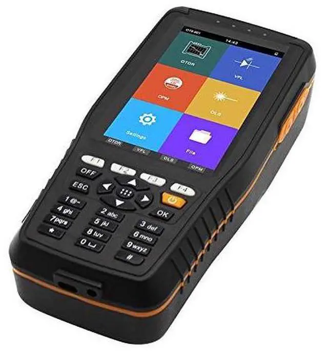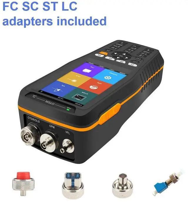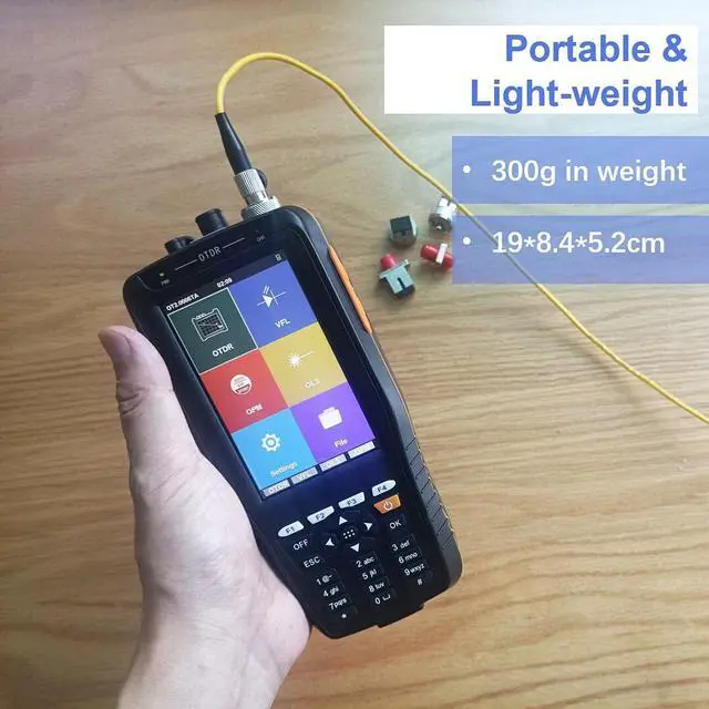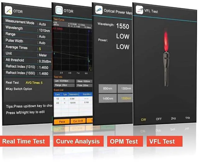 4 in 1 Multi-Function Tester -- OTDR: 1310/1550nm, 22/20dB, 0-60km; VFL: 10 KM Range; OPM: -70~+10dBm; OLS: 1310/1550nm; it is a cost-effective yet powerful multi-functional optic cable tester