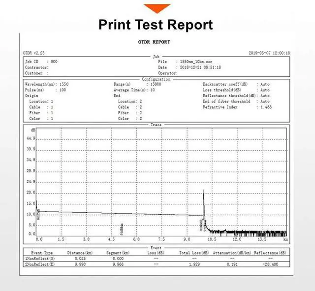 Processing Test Data -- can upload to PC via USB port, further analysis or processing can be done via management software. Or you can save it as .sor format file or print in batch. Report include test condition, test curves, link loss, average loss, etc