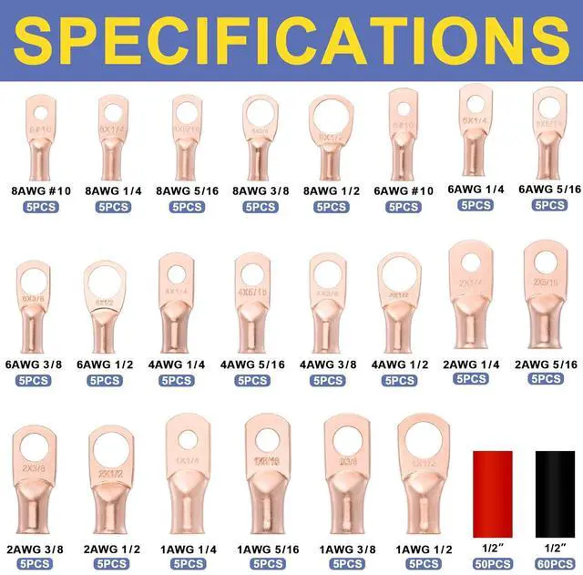 EXCELLENT INSULATION:Equipped with 110PCS 3:1 heat shrink tubing.The heat shrink tube are perfectly sized to fit the ring terminals and good insulation and sealing effect guarantee correct work.Whether you used on automotive,atv,marine,motorcycles,solar panels,power distribution,or household appliances,the cable lugs assortment are your best choice