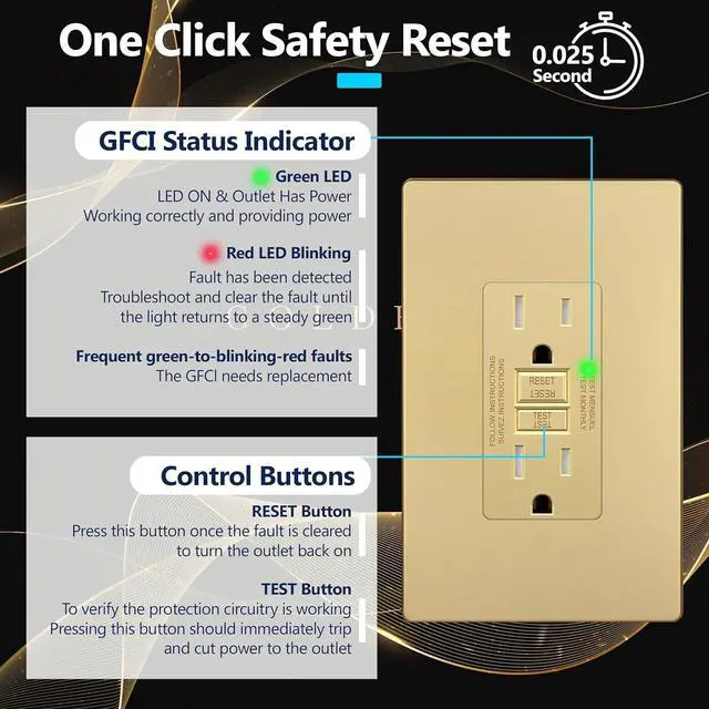 Advanced Ground Fault Protection LIDERs GFCI outlet is engineered with fast-response ground fault protection, cutting power within milliseconds of detecting a fault to prevent electric shock. Built-in reset and test buttons offer simple manual control and reliable safety in bathrooms, kitchens, garages, and other wet or high-risk areas.
