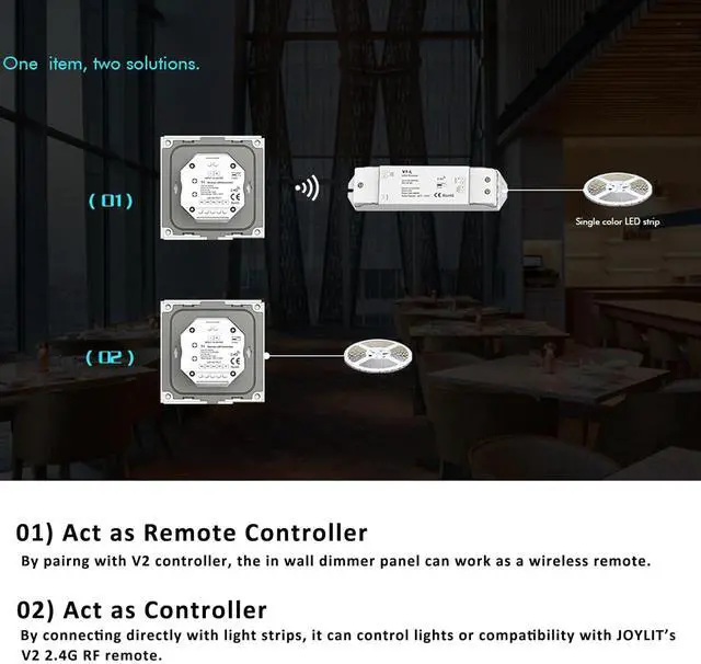 [ 2 Working Modes ]: It can be directly connected to the 12V-48V CCT LED Strip, used as a PWM dimming controller; can also be connected to our V2 controller, used as an RF wireless panel remote control, you can install this in wall touch panel next the door, and the V2 remote install at your bedside to achieve bi-directional control
