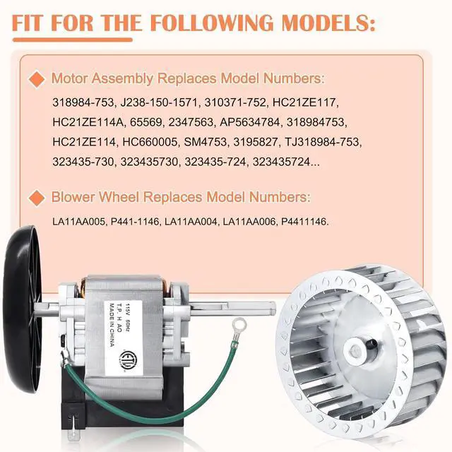 Furnace Inducer Motor Assembly Replaces Model Numbers: J238-150-1571, HC660005, 318984-753, HC21ZE117, 318984753, TJ318984-753, K674, 10704, HC21ZE114A, 2347563, AP5634784, HC21ZE114, SM4753, 3195827. Blower Wheel Replaces Model Numbers: LA11AA005, P441-1146, LA11AA006, LA11AA004, P4411146.