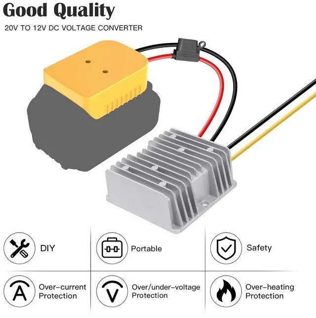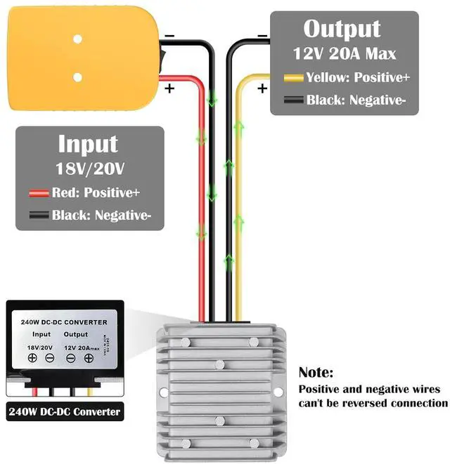 Step down converter: Input voltage: DC 18V-20V; Output voltage: DC 12V; Output current: 20A Max; Output Power: 240W Max. Our voltage reducer adopted synchronous rectification technology further improve conversion efficiency and good stability