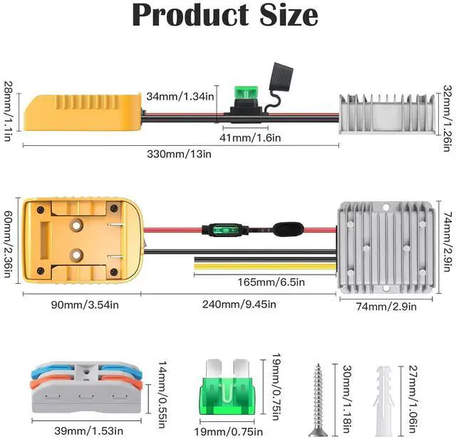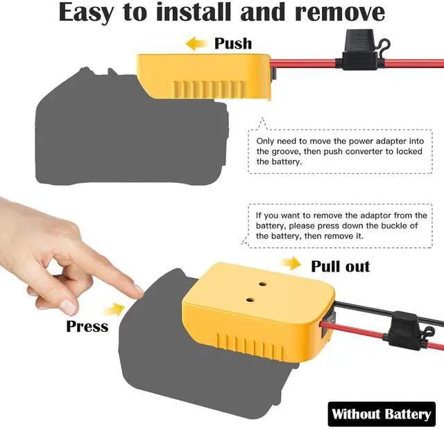 Easy to use, battery connector added switch ensures you can turn on&off the battery easily, equipped 30Amp fuse protect battery devices from overpower damage. We combine the battery adapter and the voltage converter with 2 heat-resistant wires. making it easier to use, just install the battery to the battery adapter and then connect the voltage converter to your device (Note: Battery NOT Included)