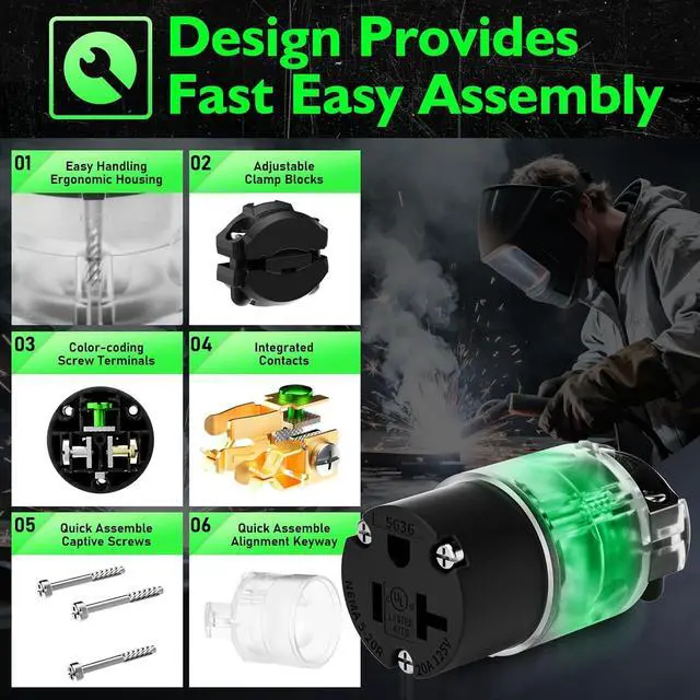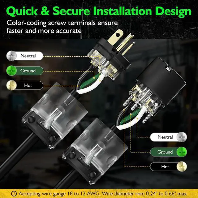 Quick-Secure Installation System: Dimpled grip body + transparent terminal covers + alignment keys enable 50% faster wiring. Auto-threading screws and angled wire holes accept 18-12 AWG cords. Color-coded terminals (Hot/Neutral/Ground) prevent wiring errors.