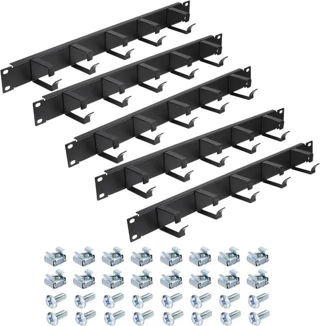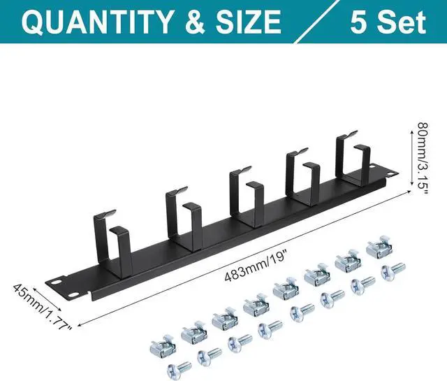 Dimension: 483mm x 80mm x 45mm/19 inch x 3.15 inch x 1.77 inch(L*W*H); Package: 5 Pcs x 1U 19 Inch 5 D-Ring Cable Manager(with 20 Silver Cabinet Screws and Nuts)