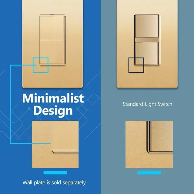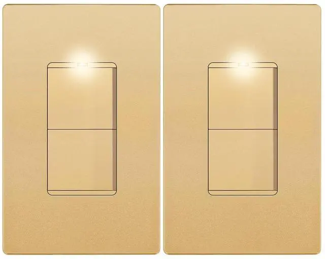 Gold color; 2 Pack; device dimensions: 1.42 weight x 2.77 height x 1.40 depth; 15A, 120-277VAC, single pole; break-off plaster ears; ground terminal; wiring instructions included; wall plate sold separately; 1-year warranty; UL Listed