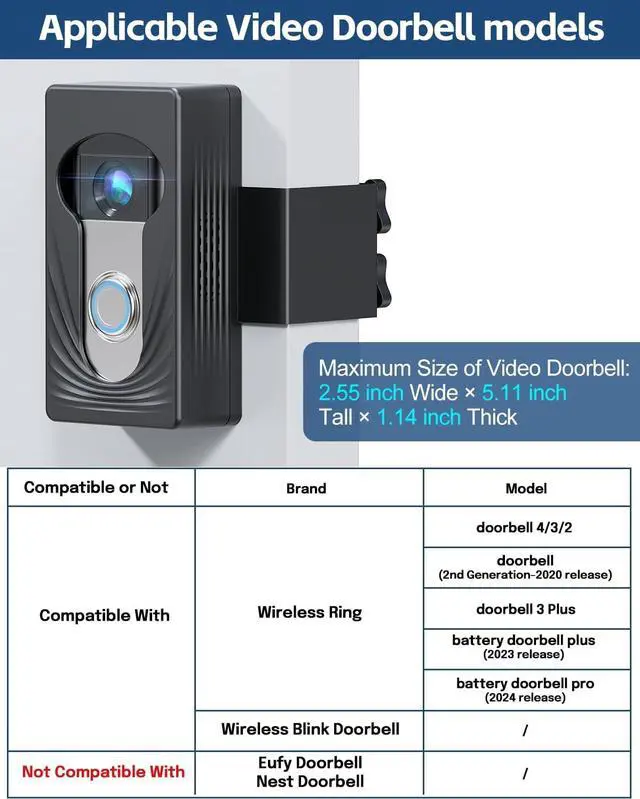 Compatible With Ring and Blink Wireless Doorbells: Trushome doorbell mount is compatible with Ring doorbell 4/3/2/ & Ring Doorbell(2nd Generation-2020 Release)& Ring Doorbell 3 Plus & Ring battery doorbell plus(2023 release)& Ring battery Doorbell Pro(2024 Release), Blink doorbell. Note: Only for wireless video doorbells, not for wired onesThe doorbell mount not compatibel with Eufy and nest mount.