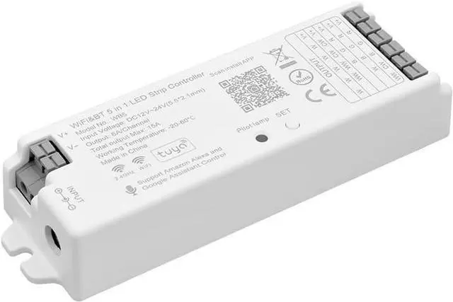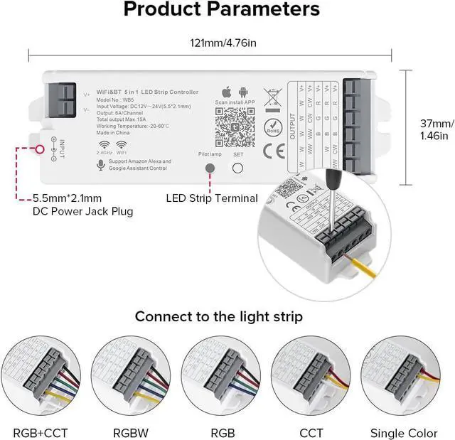 5 in 1 WiFi ControllerWB5=C01W+C02W+C03W+C04W+C05W.C01W=Single Color,C02W=CCT (Dual White),C03W=RGB,C04W=RGBW, C05W=RGB+CCT.This Controller supports PWM monochrome, CCT, RGB, RGBW, RGB + CCT, WW+CW LED strip.Switch mode by one setting button.