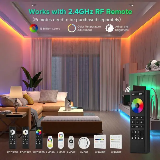 3 control methods1st:Compatible 2.4GHz RF Remote LM087,LM007,LM096,LM091,WR01RF,WR02RF,RC01RFB,RC02RFB,RC03RFB,RC04RFB,RC05RFB 2nd: Tuya Smart ,Smart Life APP 2.4GHz Wi-Fi control. 3rd: Alexa, Google Home Assistant control.Three methods can be used at the same time.