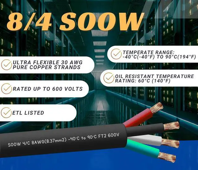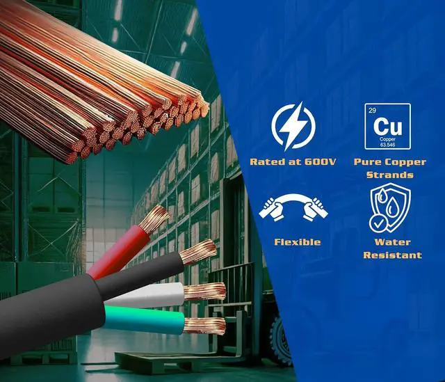 APPLICATIONS: portable power, electric vehicle chargers, extension cords, heavy equipment, construction machinery, motor leads, welding leads, portable lighting, battery chargers, shallow water immersion, mining environments, and applications where a rugged, heavy duty flexible multi-conductor cable is required.
