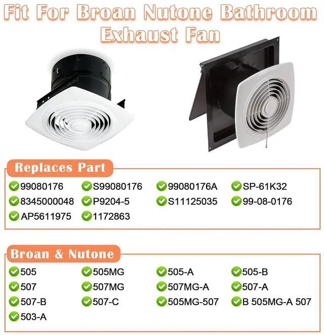 Fits Broan Nutone Vent Fan Blower Motor - 99080176, S99080176, 99080176A, SP-61K32, 8345000048, P9204-5, S11125035, 99-08-0176, AP5611975, 1172863. Fits Broan Nutone Ventilation Fan Models - 505, 505MG, 505-A, 505-B, 507, 507MG, 507MG-A, 507-A, 507-B, 507-C, 505MG-507, B 505MG-A 507, 503-A.